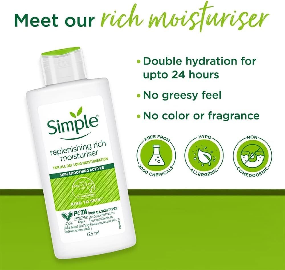 ابرسان سیمپل مدل ریچ (Simple Kind to Skin Replenishing Rich Moisturiser) یکی از محصولات محبوب برند سیمپل است که به دلیل فرمولاسیون ساده و ملایم خود، مورد توجه بسیاری از افراد با انواع پوست، به ویژه پوستهای حساس، قرار گرفته است. این محصول با هدف تامین رطوبت و تغذیه عمقی پوست طراحی شده و در عین حال از مواد تحریککننده و مضر خالی است.