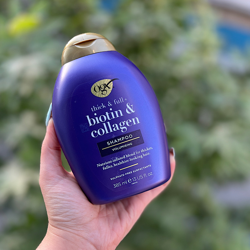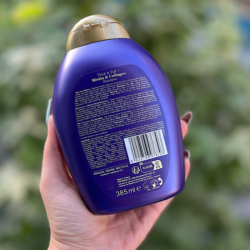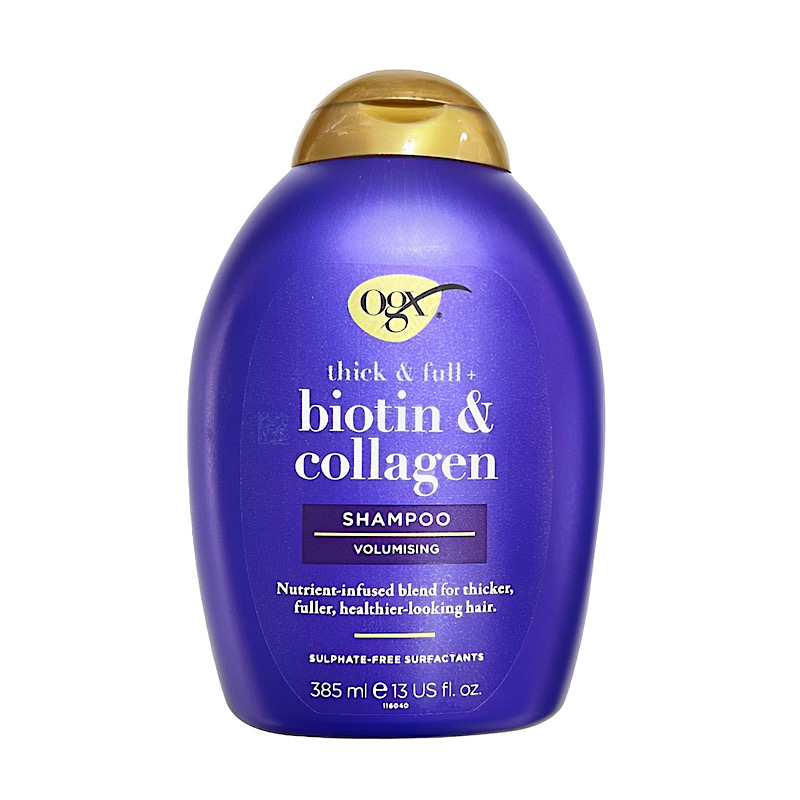 شامپو ضد ریزش و ضخیم کننده مو حاوی بیوتین و کلاژن او جی ایکس با حجم 385 میلی لیتر و محصول آمریکا، یکی از پرفروش ترین و محبوب ترین شامپوهای برند OGX است. این شامپو با داشتن دو مورد از مهم ترین ترکیبات تقویت کننده مو یعنی بیوتین و کلاژن، به شما کمک می کند تا موهای قوی و محکم تر با درخشش بیشتر، موخوره کمتر و صافی طولانی مدت داشته باشید. شامپو حجم دهنده و ضخیم کننده مو بیوتین و کلاژن OGX با تزریق مواد مغذی به تارهای مو، به حجیم شدن و ضخیم شدن موهای ظریف کمک می کند. همچنین آسیب های موها که ناشی از رنگ مو و وسایل حرارتی هستند را بهبود می دهد.
