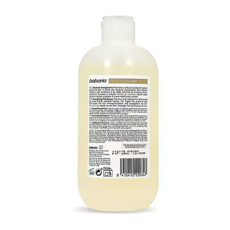 شامپو sos باباريا مناسب موهای اسیب دیده و مستعد ریزش است و حاوی عصاره جیسینگ و حاوی عصاره زردچوبه و حاوی روغن کرچک هیدروژنه است. شامپو SOS باباریا BABARIA، دارای قدرت پاک کنندگی بالا است.