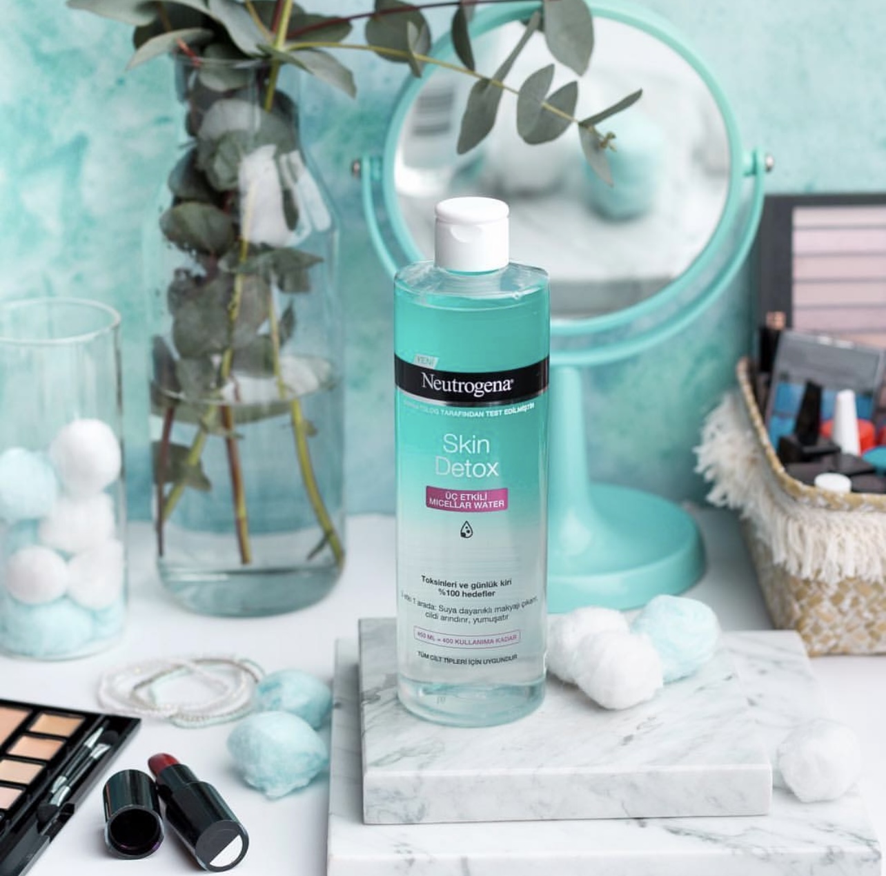 1. ابتدا از میسلار واتر Neutrogena Skin Detox برای پاکسازی پوست استفاده کنید.