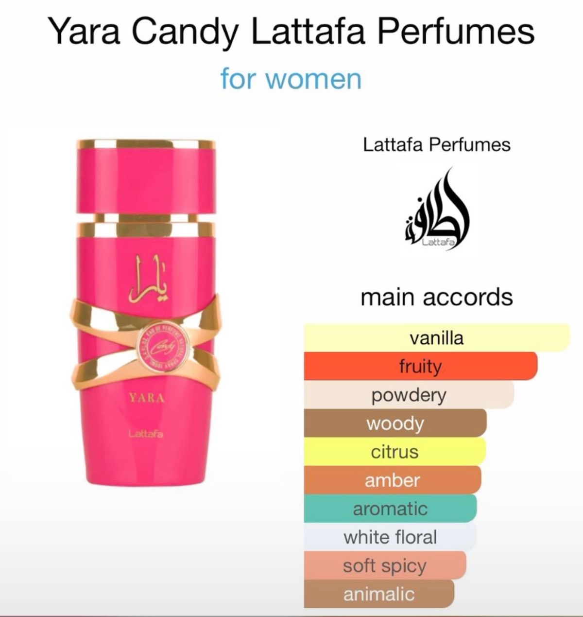 Yara Candy یکی از تازهترین عطرهای زنانه از خانه عطر Lattafa است که در سال ۲۰۲۴ عرضه شده. این ادکلن عضو سبک gourmand fruity floral هست، یعنی ترکیبی از رایحههای خوراکی (مثل شیرینی و کارامل)، میوهای و گلدار. طراحی این عطر برای کسانی است که رایحههای شیرین و جذاب دوست دارند و میخوان بوی دخترانه، شادیبخش و با طعم “کاندیشاپ” یا آبنبات داشته باشند.